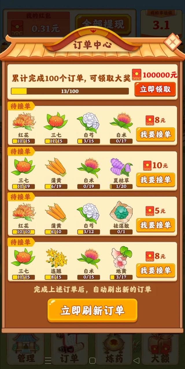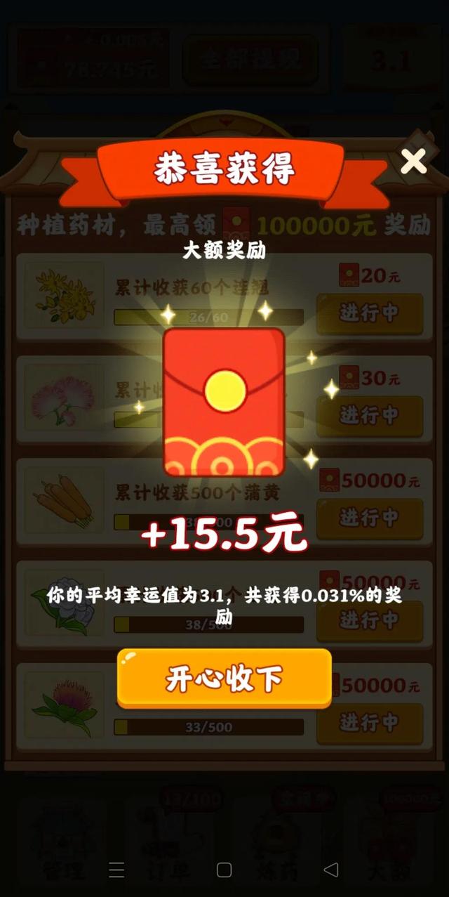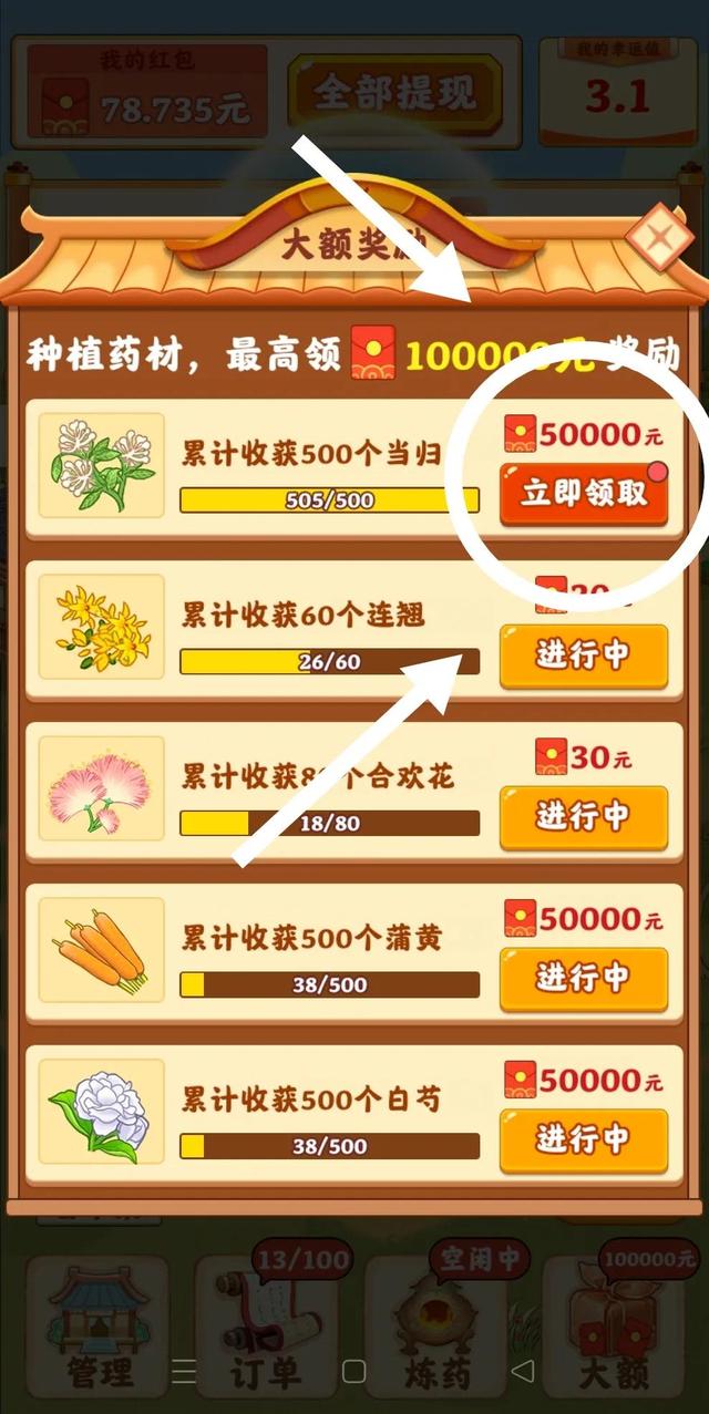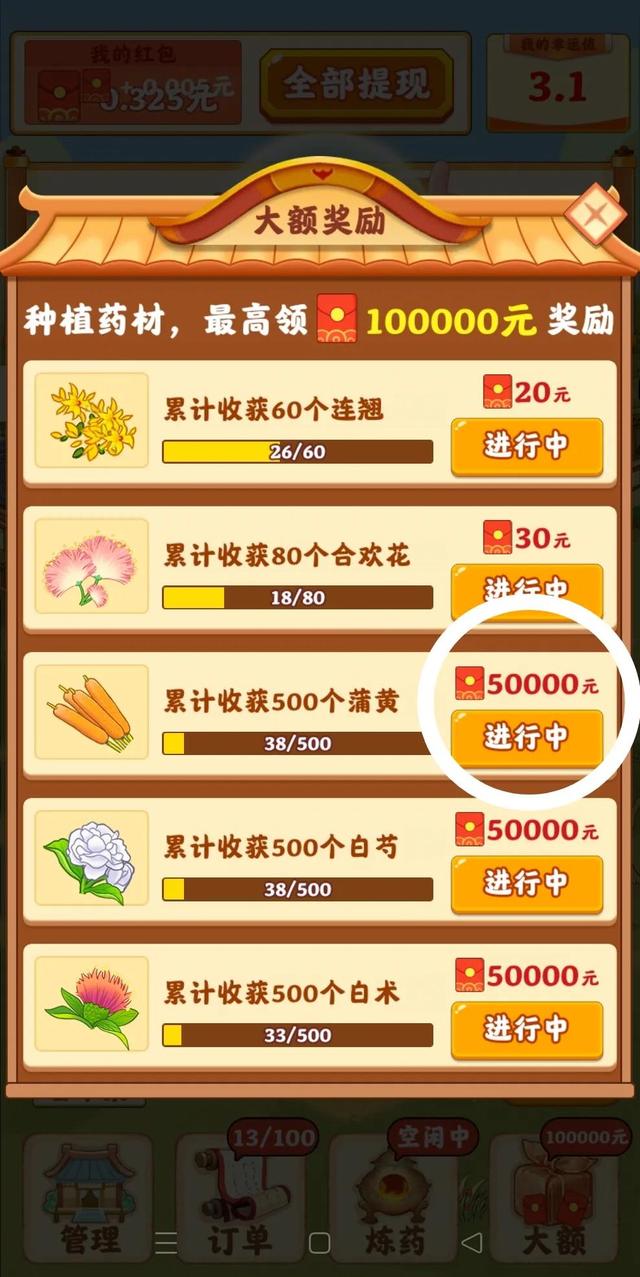 3块就3块吧,现在马路上想捡3块钱也不容易。了解了规则,我静下心来仔细看了看种菜任务,发现有个种500个菜给50000块钱红包的任务