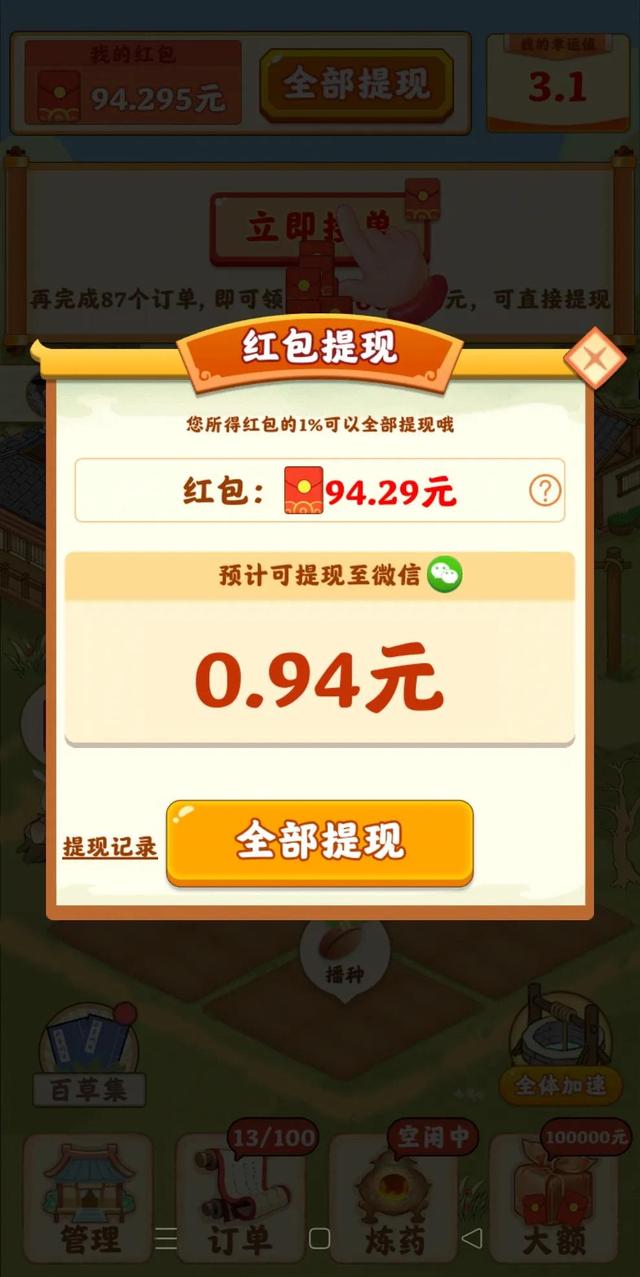 宣传的时候说的真好,有多少红包就能提现多少,没有套路,只有真诚。结果啪啪打脸,我昨天在百草园做了好多种菜的任务,存了300块钱红包