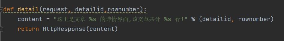 接收上述格式的参数,我们直接在视图里获取即可。并且加上?号后,django就不会把?号之后的部分看作视图了,而是把他们看作参数了。例如:http://127.0.0.1:8000/detail?detailid=12345689&rownumber=200 直接匹配的是detail视图,?号之后的内容被django忽略了。我们先运行下述代码: