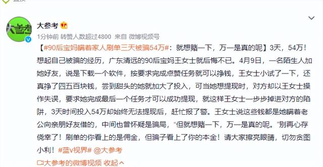 最近,这条《90后宝妈瞒着家人刷单三天被骗54万:就想赌一下,万一是真的呢》引起了很多人再度关注了兼职刷单这个行业。