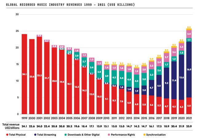 作为过来的人的我们知道,在这段艰难探索的日子里,iPod 和 iTunes 音乐商店给了这个模式最后的回光返照,并一路坚持到了 2010 年代的头几年,直到 2011 年开始流媒体开始大规模兴起,并在短短的六年时间内,成为了音乐产业收入占比的最大头。